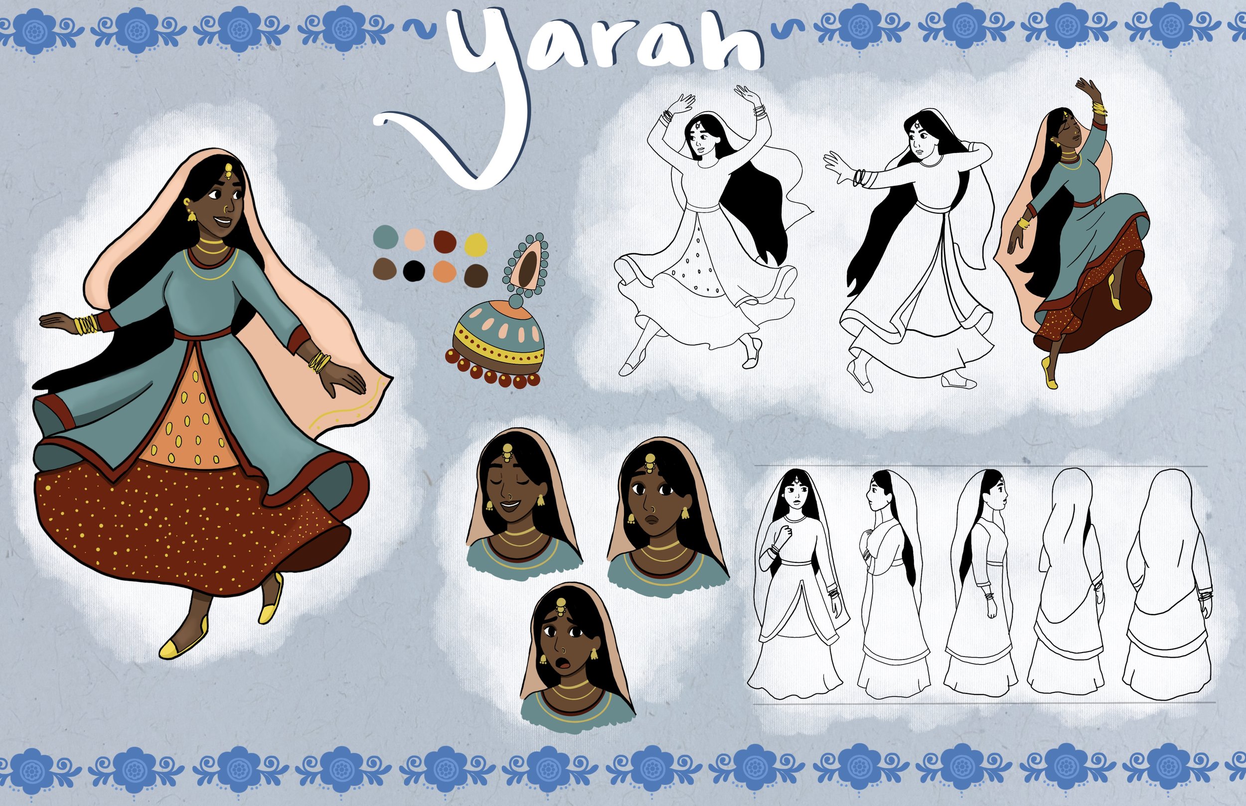 My goal was to make Pakistani characters you don’t typically see in media. Growing up I never had that representation other kids did and I feel it’s important as an artist to create that representation. For this class we had to take a story that has already been done and make it our own. I was heavily inspired by the story Aladdin because Jasmine was the one princess that I saw myself in regardless of her terrible misrepresentation. My take on the story is called Yarah.