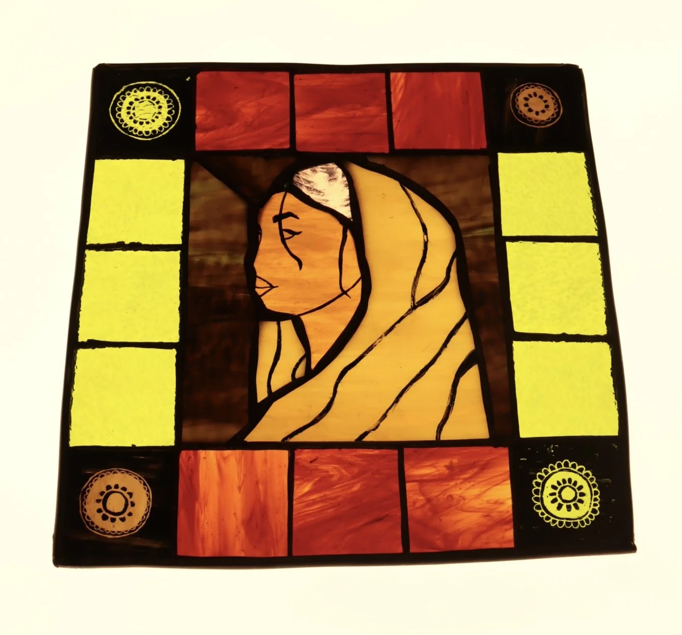 This piece is a reflection of cultural memory, identity, and the quiet strength carried by South Asian women across generations. Rendered in warm ambers, deep reds, and vibrant yellow-green glass, the work centers a woman in traditional clothing, her profile outlined by simple, intentional lines. I wanted her to feel both timeless and grounded. Rooted in tradition yet illuminated in a contemporary medium.