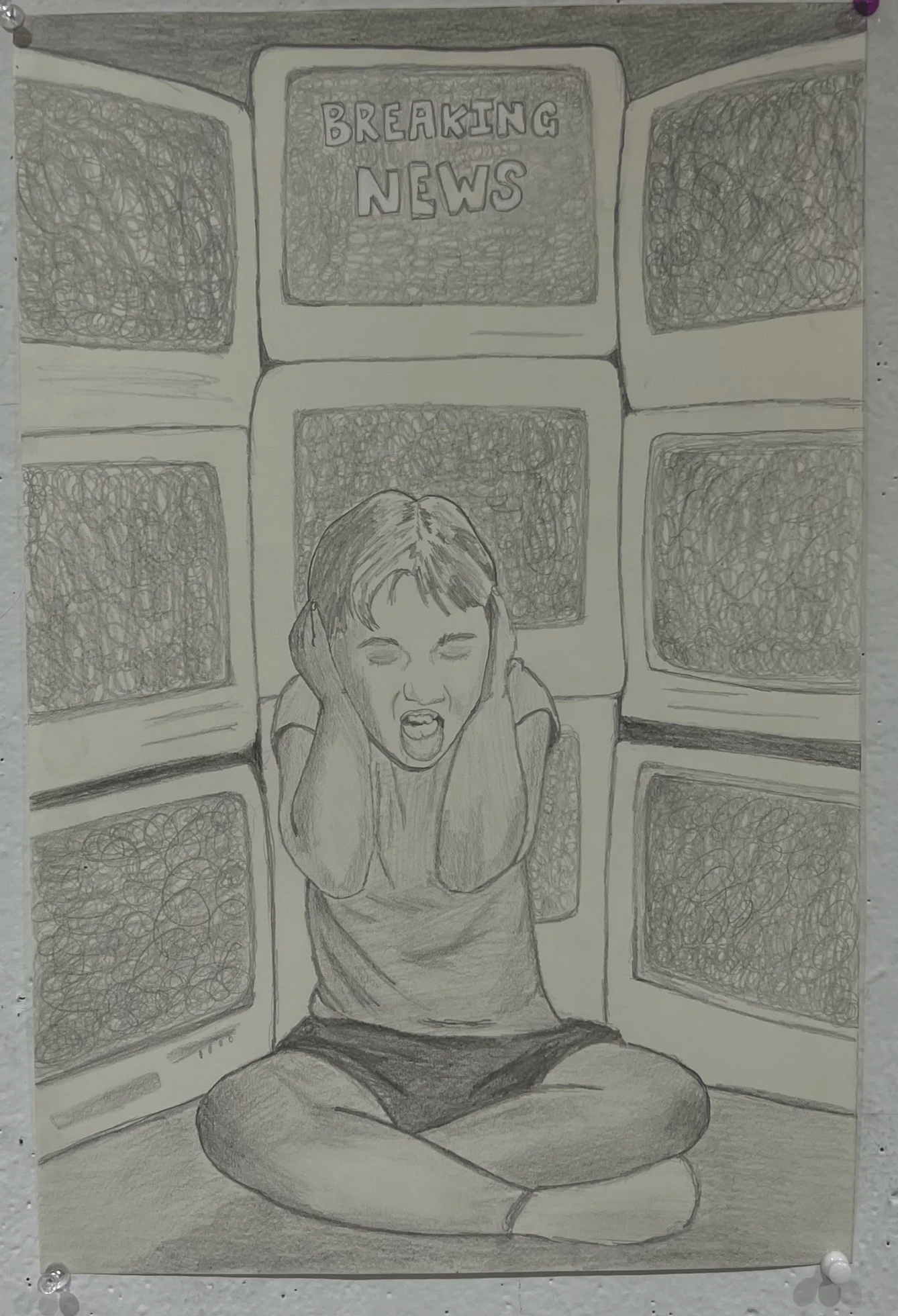 I used pages from my coloring books for the wallpaper and then cut and pasted her drawing onto the background. With a mix of pastels,graphite, colored pencils, and posca paint markers.
